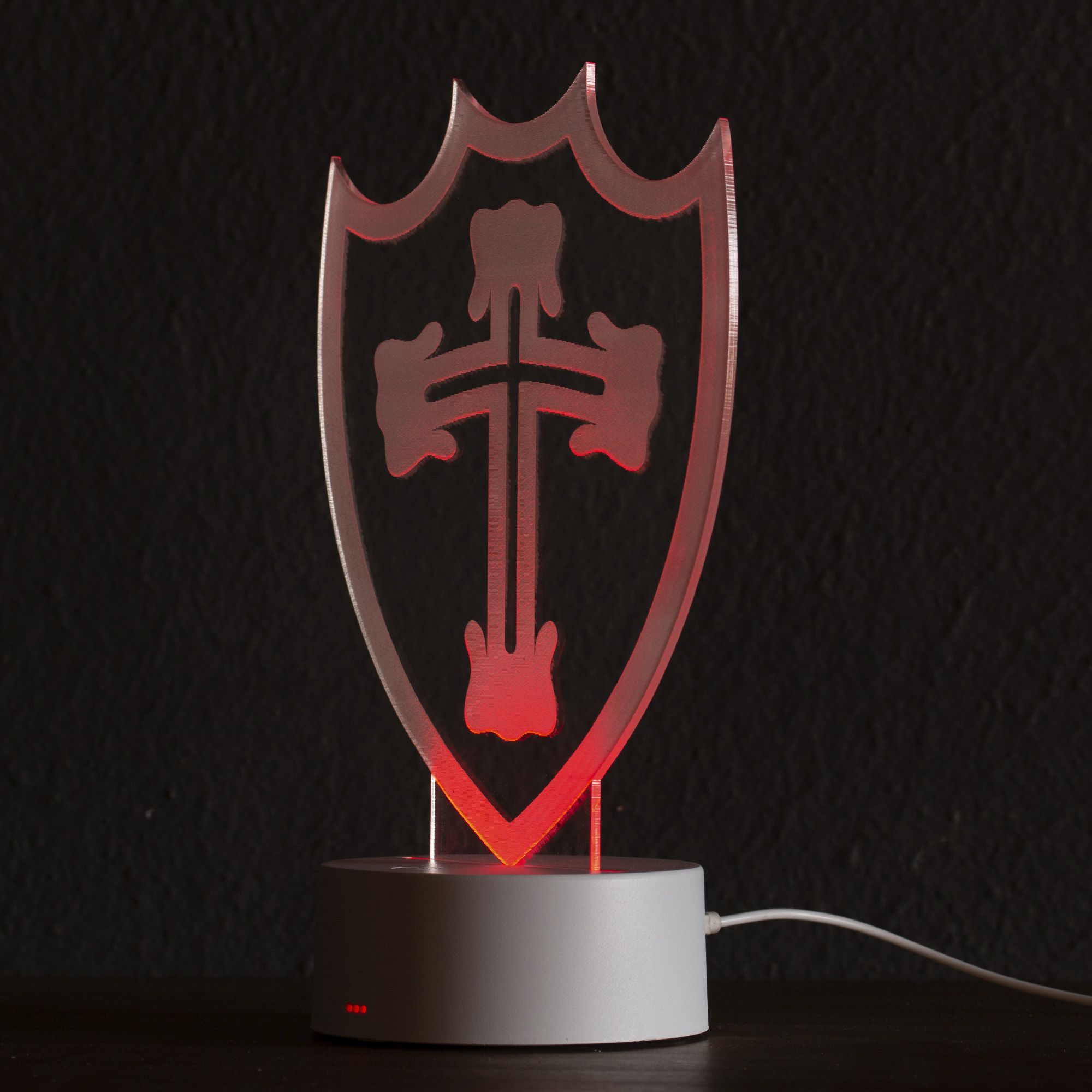 Display Escudo Portuguesa, ideal para presentear e decorar ambientes diversos, como quartos, salas, escritórios, etc. O display é fabricada em acrílico transparente de 3mm com gravação a laser. Possui base led com botão touch para troca de cores.